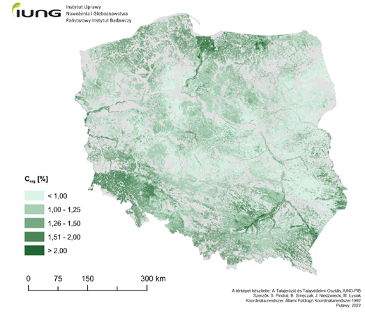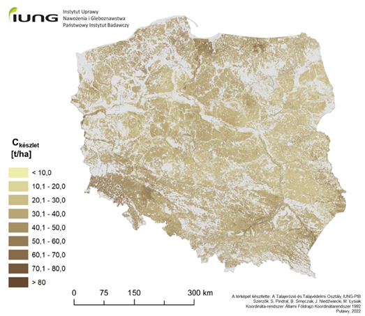 2. ábra: A lengyelországi ásványi talajok szervesszén-készlete (tonna/hektár)